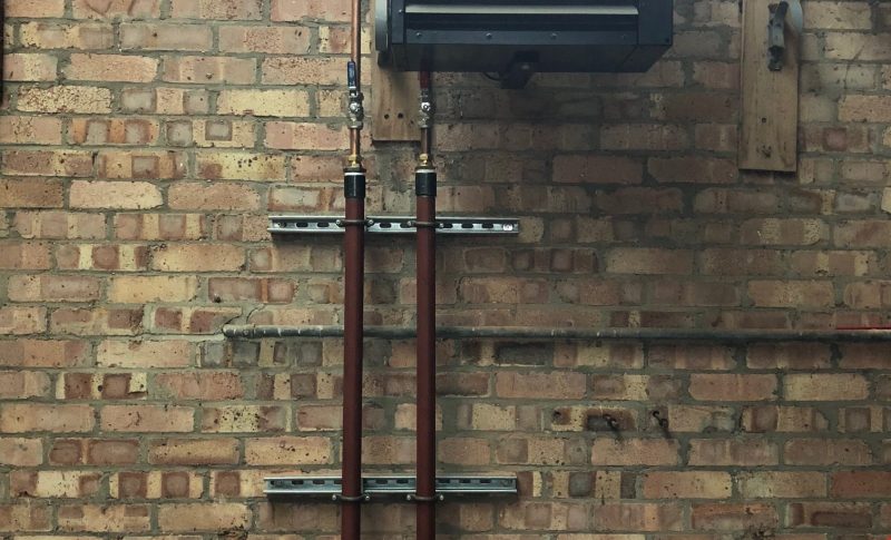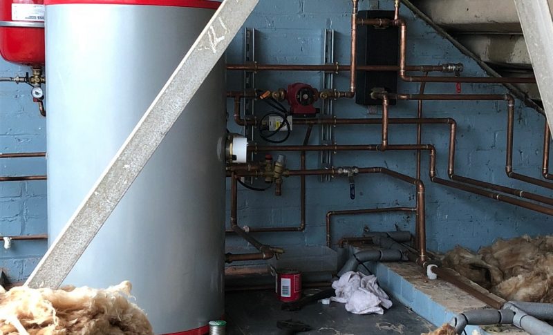 1 1″1/2 threaded bsp pipework . With copper hot water system with radiators and fans added for heating in skill centre that had no heating or hot water previously.